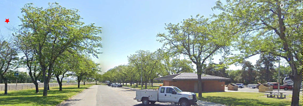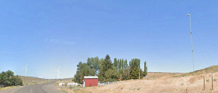 As I got nearer, I realized a small bird was perched on the tip. Below is a photo from Google Street View with the homestead with the tower off to the right side. Note, also, the two large towers on the left, at a distance.