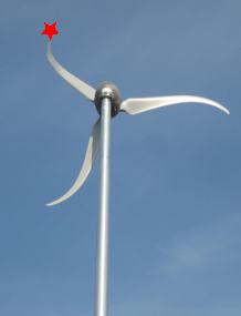 On Friday, returning from vine pruning at White Heron Cellars, the wind wasn’t blowing and the blades were still. I saw two interesting things. There was a Bald Eagle cruising over the towers on my left. I could watch for only a few seconds even though I was going only about 50 mph. The small home-sized tower had a visitor. Where the red star is on the image (web sourced) a small bird was perched. She was about sparrow or finch sized. When the tower came into view, I realized the point of the upper left blade had an unidentified non-flying object.