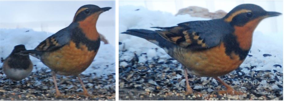 Here’s a nice start that was photographed today, in our front yard, to begin an otherwise bad report day. Last Thursday night at the Audubon meeting we just heard about this bird, a Varied Thrush. We have had a couple hanging around our feeders ever since. I thought when I first saw one last week that it was a Rufous-sided Towhee, but apparently that name has changed, and it is a different bird: (this below from Audubon)