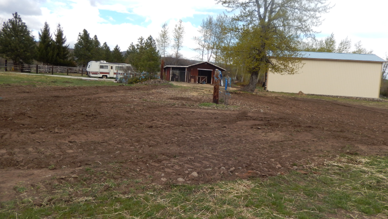 Above left is the before of the front area needing re-contoured. On the right is it in progress. Note the dirt-scar of the rock crib that was there a few weeks ago. You have seen previous photos with it standing with the fence going west from it.