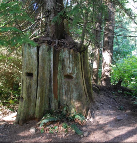 Logging & Trails The photo shows a tree on a tree. The notches in the old tree were for “spring boards.”